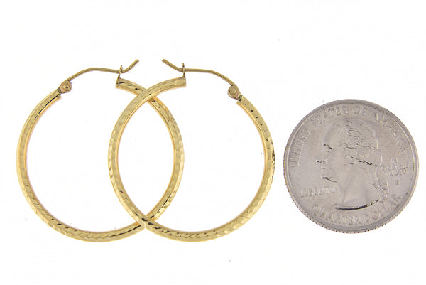 14K Yellow Gold Diamond Cut Classic Round Hoop Textured Earrings 30mm x 2mm