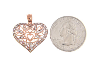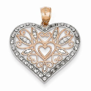 14K Rose Gold and Rhodium Filigree Diamond-Cut Heart Pendant Charm.