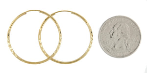 14K Yellow Gold 30mm x 30mm x 1.5mm Endless Round Hollow Hoop Earrings. Satin, diamond-cut, polished hollow tubes.