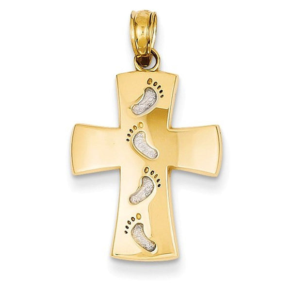 14K Yellow Gold and Rhodium Footprints Cross Pendant Charm.