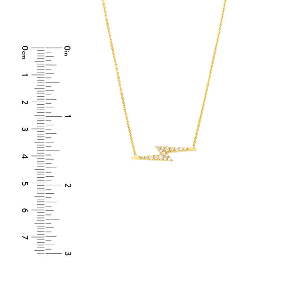 Strike the right look in this divine Thunderbolt Necklace. Crafted for you in 14K Gold, this necklace is adjustable 16-18 inch and features 1/8tcw in diamonds.