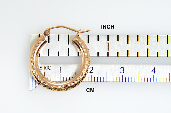 14k Rose Gold Diamond Cut Round Hoop Earrings on a White Background